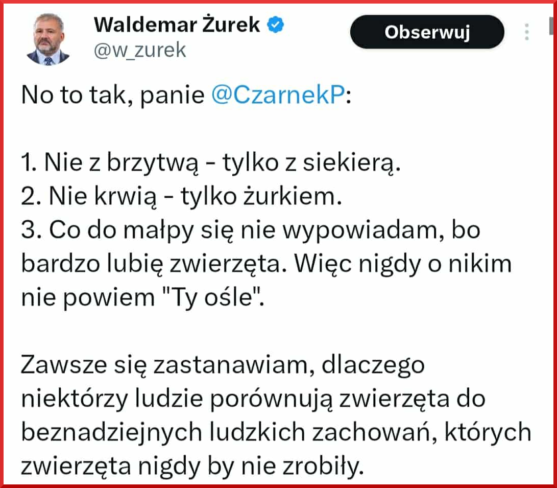 „Mamy małpę z brzytwą w Ministerstwie Sprawiedliwości. Ona lata i tnie. Dzisiaj wszystko jest zbroczone krwią, od tej brzytwy tej małpy” – wypalił Czarnek. Kiedy prowadzący program Bogdan Rymanowski stwierdził, że „nie jest to ładne określenie”, polityk szedł w zaparte. „Tylko ja nie chodziłem i brzytwą nie ciąłem wszystkiego, co jest do pocięcia. Pan minister Żurek, tak jak jego poprzednik Bodnar, przez ostatnie blisko dwa lata zrobili nieprawdopodobną demolkę w wymiarze sprawiedliwości” – dodał. Żurek na jego słowa zareagował za pośrednictwem Twittera, jego ripostę możecie zobaczyć poniżej.