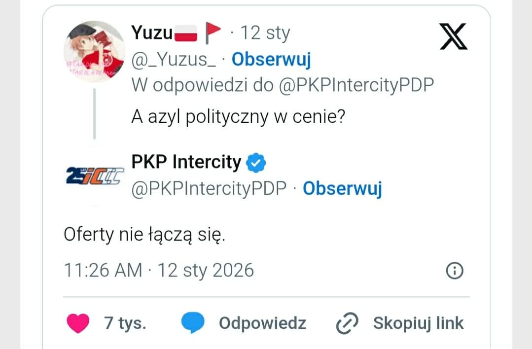 Wiadomość o tym, że Ziobro otrzymał azyl polityczny na Węgrzech, zbiegła się z promocją, jaką podróżnym przedstawiło dziś PKP Intercity. „Tylko dziś taniej zaplanujesz podróż do Budapesztu i Bratysławy🎟️🌍” – ogłoszono m.in. na portalu X. Internauci, wykorzystując okazję, postanowili nawiązać do sytuacji byłego ministra sprawiedliwości. Największy rozgłos zrobił żartobliwy komentarz użytkownika pod pseudonimem „Yuzu”. „A azyl polityczny w cenie?” – napisał. Co ciekawe PKP zareagował na jego komentarz, robiąc przy tym olbrzymią furorę. Odpowiedź możecie zobaczyć poniżej.