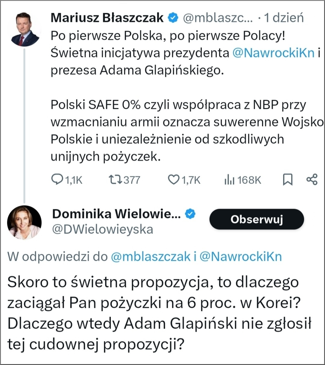 Karol Nawrocki podczas środowej konferencji podzielił się swoimi wątpliwościami dot. europejskiego programu SAFE. Przypomniał m.in., że miałby on być spłacany aż do 2070 roku. Przedstawił przy tym alternatywne rozwiązanie, jakim jest „SAFE 0%”, który miałby być sfinansowany z rezerw walutowych NBP deponowanych w złocie. „Polski SAFE 0 proc.” jest lepszy dla polskich sił zbrojnych niż europejski SAFE z tymi obciążeniami, o których dyskutujemy w polskiej opinii publicznej.[…] Zagwarantuje 185 mld zł, które nie będą wiązać się z żadnymi odsetkami ani kredytem” – przekonywał prezydent. Komplementów nad jego pomysłem nie szczędził Mariusz Błaszczak, na którego wpis szybko odpowiedziała dziennikarka Dominika Wielowieyska.