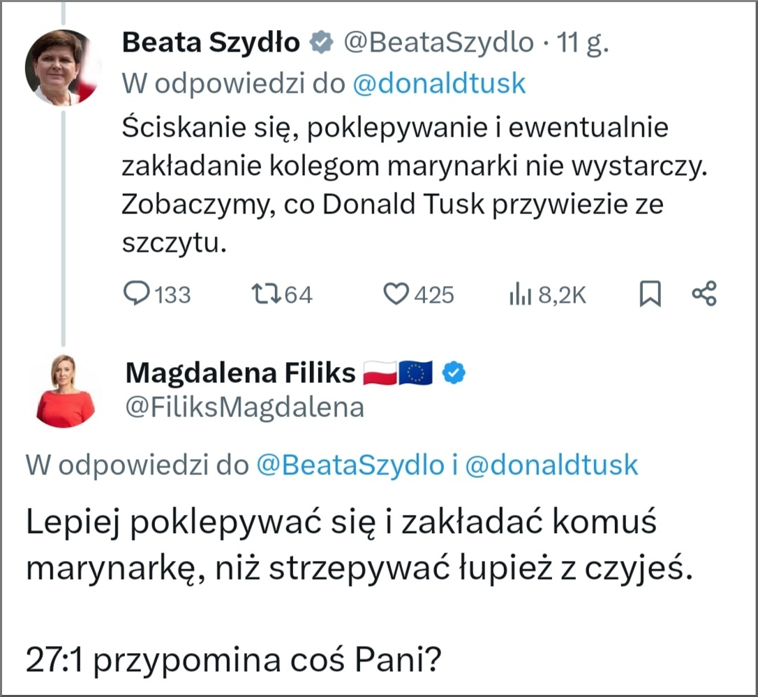 Jego nagranie wywołało lawinę komentarzy m.in. na portalu X. Jedną z komentujących osób była Beata Szydło, która pełniła funkcję prezes Rady Ministrów w latach 2015-2017. „Ściskanie się, poklepywanie i ewentualnie zakładanie kolegom marynarki nie wystarczy. Zobaczymy, co Donald Tusk przywiezie ze szczytu” – napisała w drwiący sposób. Niespodziewanie z szybką ripostą pośpieszyła posłanka Koalicji Obywatelskiej Magdalena Filiks. Jej wpis, który zyskał już ponad tysiąc polubień i zrobił olbrzymią furorę jest do zobaczenia poniżej.